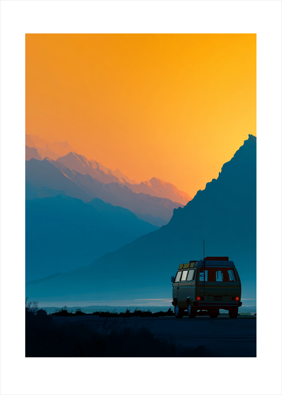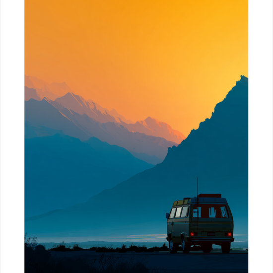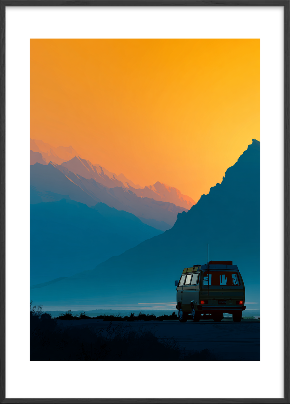 Oplev en stille aften ved bjergene med denne dekorative plakat, hvor en nostalgisk camper parkerer foran lagdelte, blå bjerge og en intens orange solnedgang. Plakaten skaber ro og rejseglæde i ethvert rum med sit rene formsprog og dramatiske farvekontrast. Trykt på kvalitets papir i høj opløsning giver motivet dybde og en flot farvegengivelse, perfekt til ramme og ophængning i stuen eller sommerhuset. Motivets moderne æstetik fungerer både som statement-piece og som roligt blikfang over sofaen eller i en entré. Udført i en moderne digital kunststil med klare flader og minimalistisk komposition, er dette et oplagt valg til dem, der søger en tidløs plakat med stemning. Vælg din størrelse, tilføj ramme og få et kunsttryk, der inviterer til ro og eventyr hver dag.