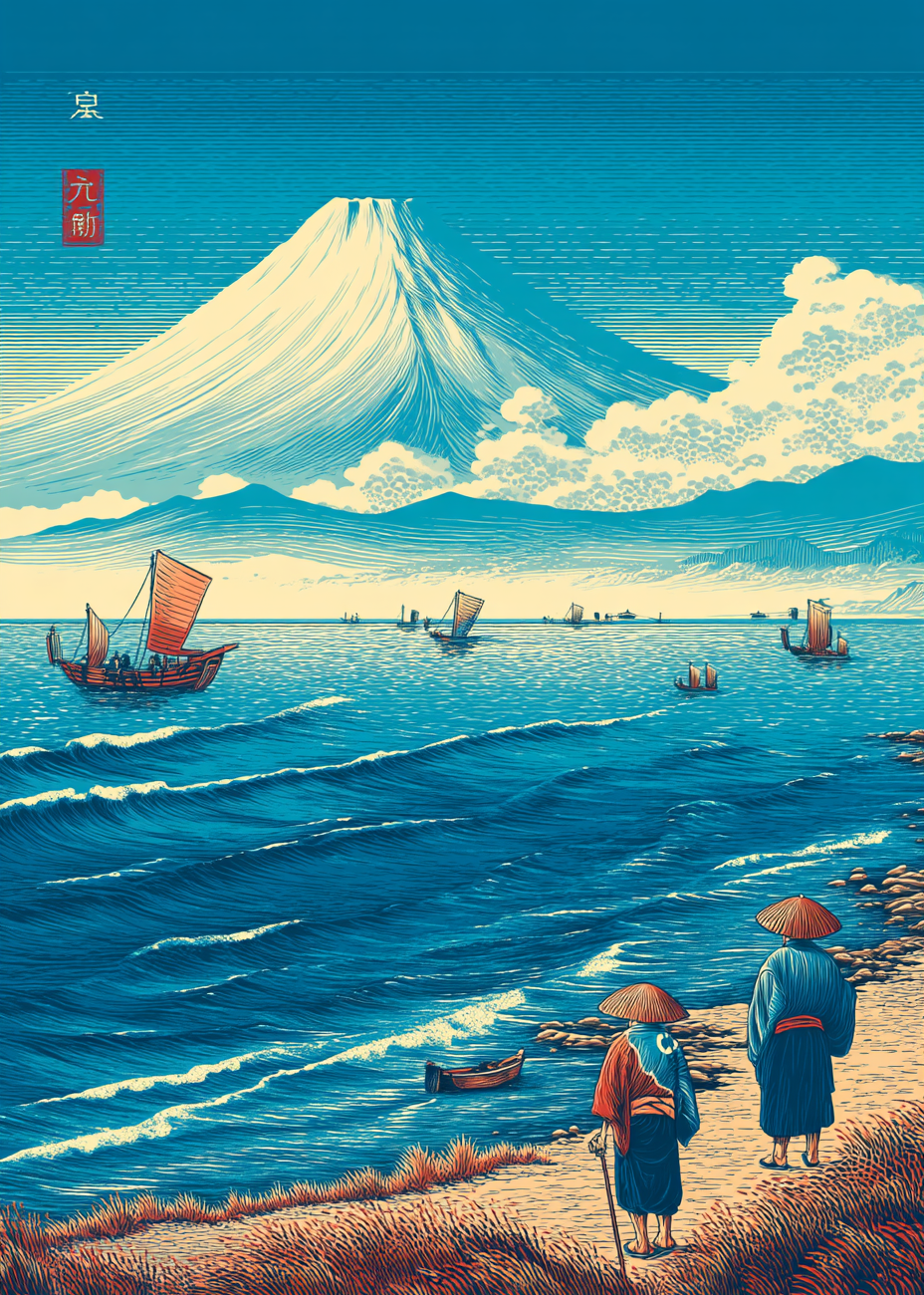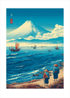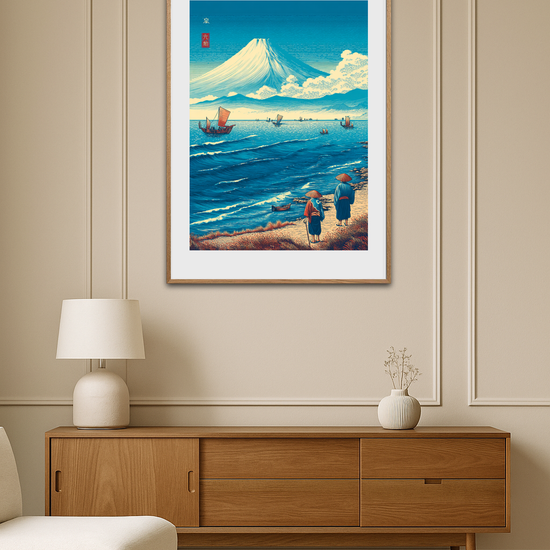 Smuk plakat der fanger roen ved kysten og den ikoniske silhuet af et snedækket bjerg i horisonten. Perfekt til at skabe et fokuspunkt i stuen eller sommerhuset, hvor dybe blå toner og varme cremefarver giver et elegant kontrastspil. Trykt på kvalitets papir med høj farveægthed, så hver linje og bølge står skarpt og holdbart. Motivets detaljer og komposition gør den ideel alene eller som del af en billedvæg. Dette værk er udført i en moderne fortolkning af ukiyo-e træsnitstilen, og kombinerer traditionel japansk æstetik med nutidig grafisk klarhed. Fås i flere størrelser og rammevalg — vælg en finish, der passer til dit hjem, og giv væggen en tidløs, kunstnerisk atmosfære.