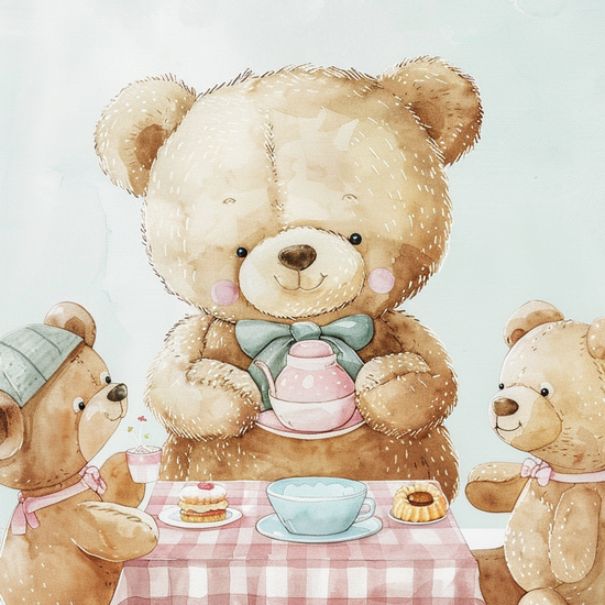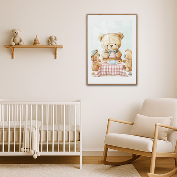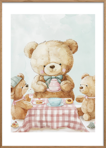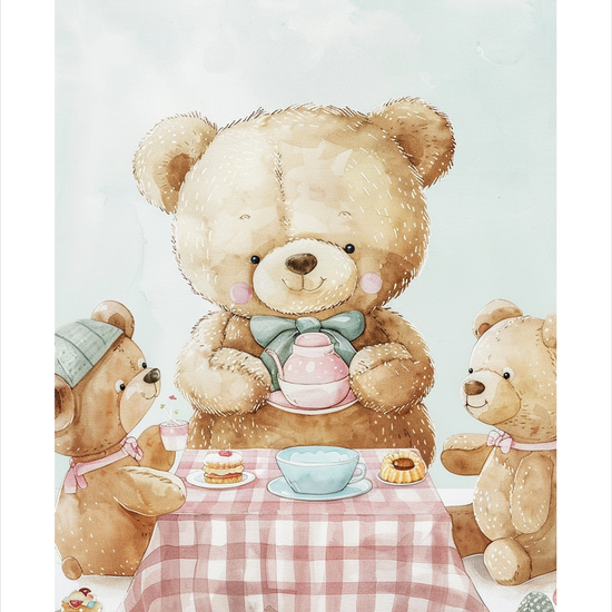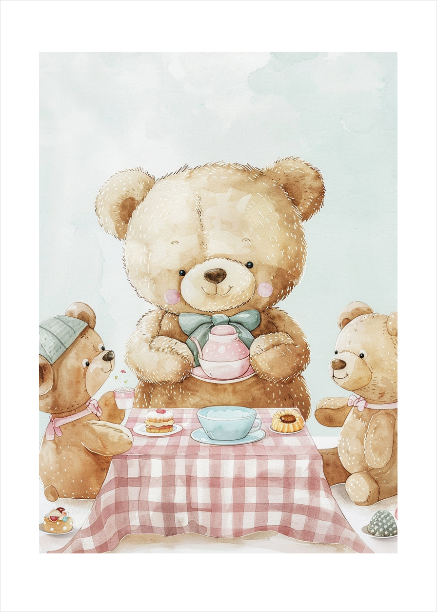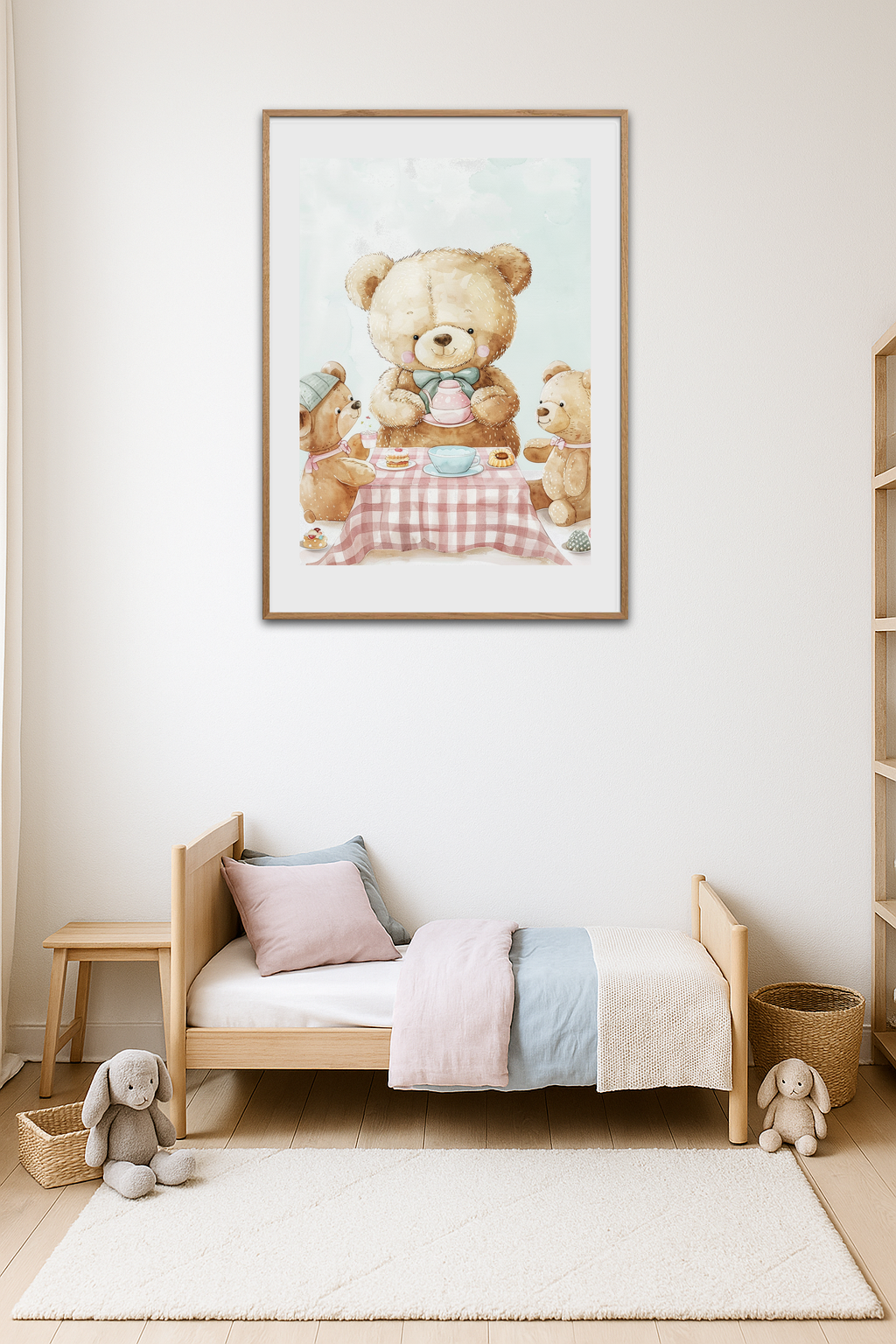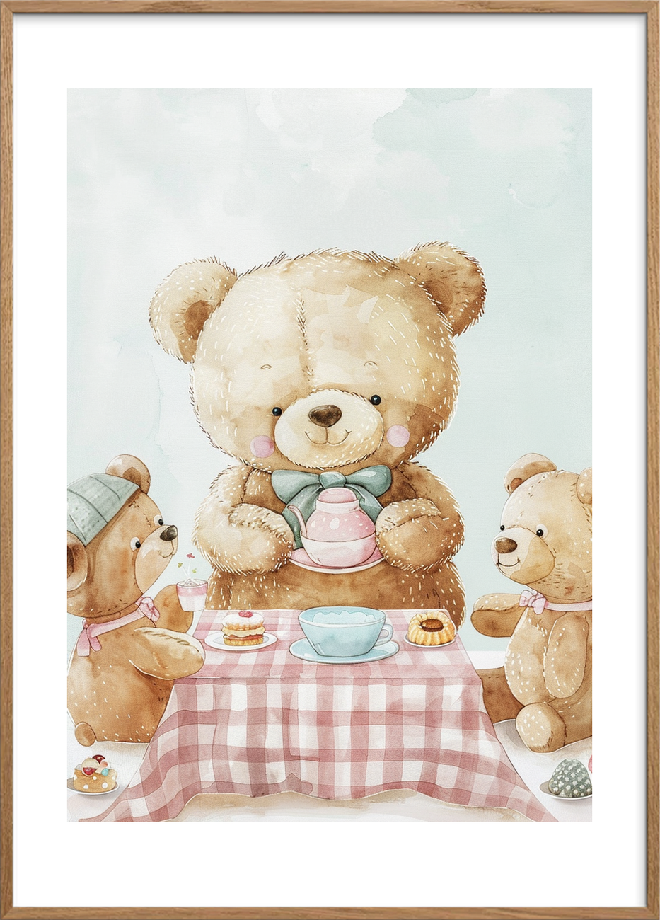 Giv børneværelset et blidt og hyggeligt løft med denne charmerende plakat med bamser til te-selskab. Plakaten er udført i akvareller med bløde penselstrøg og delikate detaljer, hvilket giver et varmt og indbydende udtryk, som børn elsker. Motivet er designet til at inspirere leg og tryghed, samtidig med at farvesammensætningen gør den let at matche med både neutrale og farverige indretninger. Trykt på kvalitets papir i høj kvalitet og tilgængelig i flere størrelser, så den passer perfekt over puslebordet, sengen eller i en hyggelig læsekrog. En oplagt gaveidé til dåb eller fødselsdag — let at indramme og nem at kombinere med andre plakater. Bestil nu og skab et blidt, fantasifyldt hjørne i dit barns univers.
