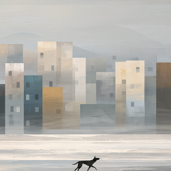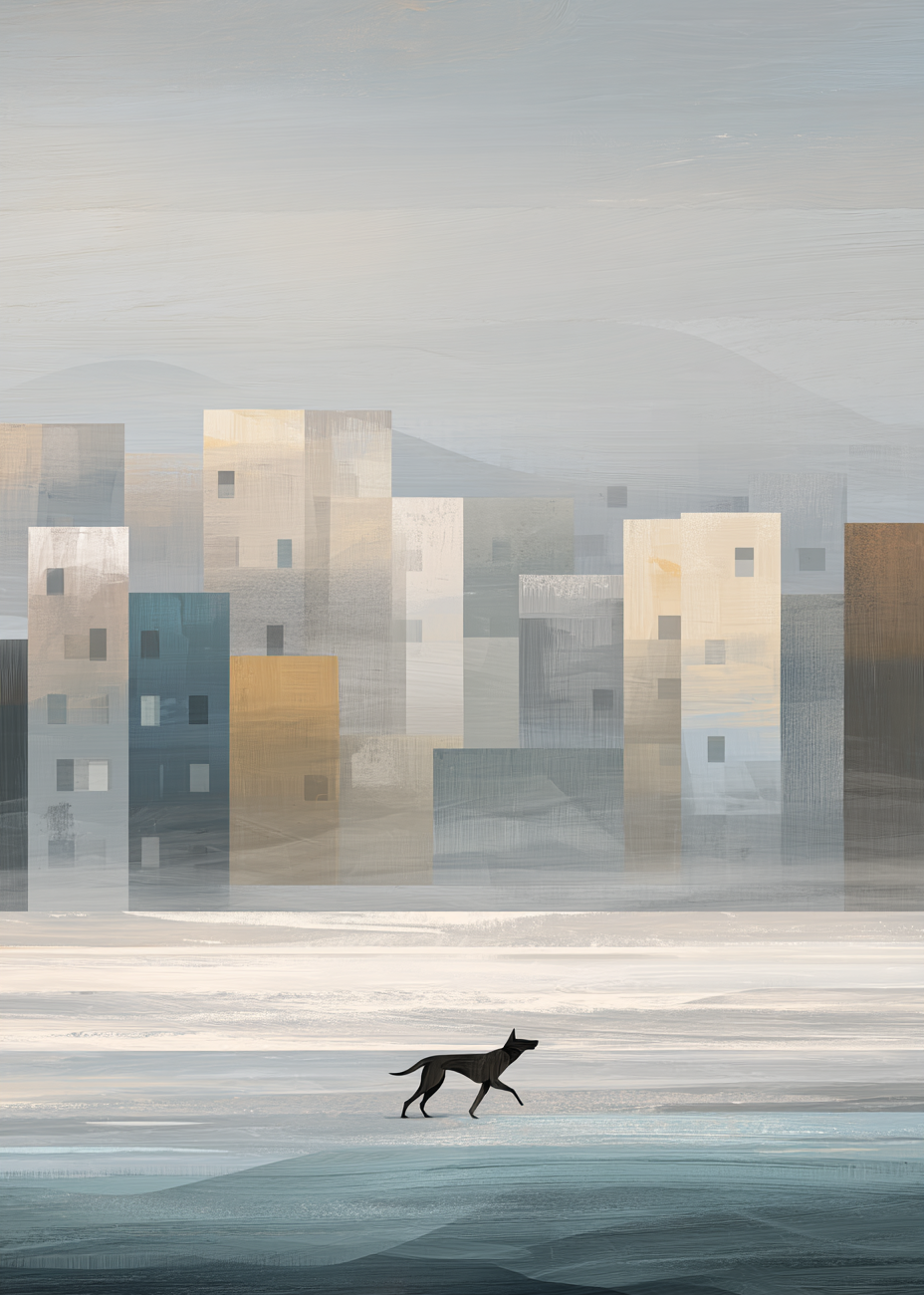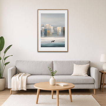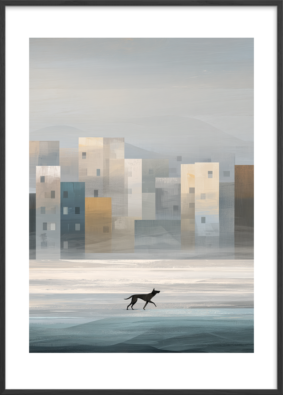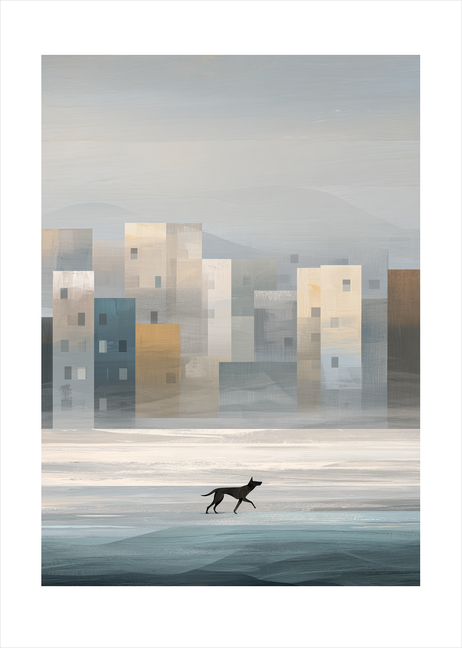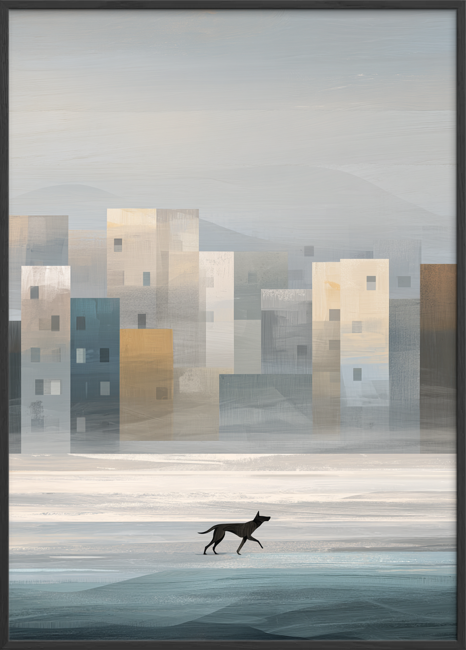 Bring ro og moderne elegance ind i dit hjem med denne plakat, der skildrer en stiliseret byfront og en ensom hund på en rummelig kyst. Motivets rene linjer og bløde farvepalet skaber en afbalanceret og indbydende atmosfære, perfekt til stuen eller sommerhuset. Trykt i høj opløsning på kvalitets papir og tilgængelig i flere størrelser, fungerer plakaten både som blikfang og som en subtil baggrund til din indretning. Det grafiske udtryk gør motivet let at kombinere med både skandinaviske og moderne interiører. I en nutidig, abstrakt og minimalistisk stil trækker værket på geometriske former og lagdeling for at skabe dybde og rytme. En ideel gave til designelskere og dem, der ønsker en rolig, kunstnerisk stemning i hjemmet.