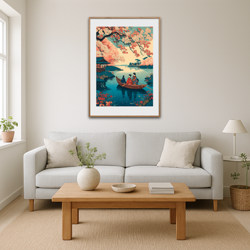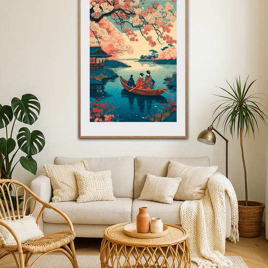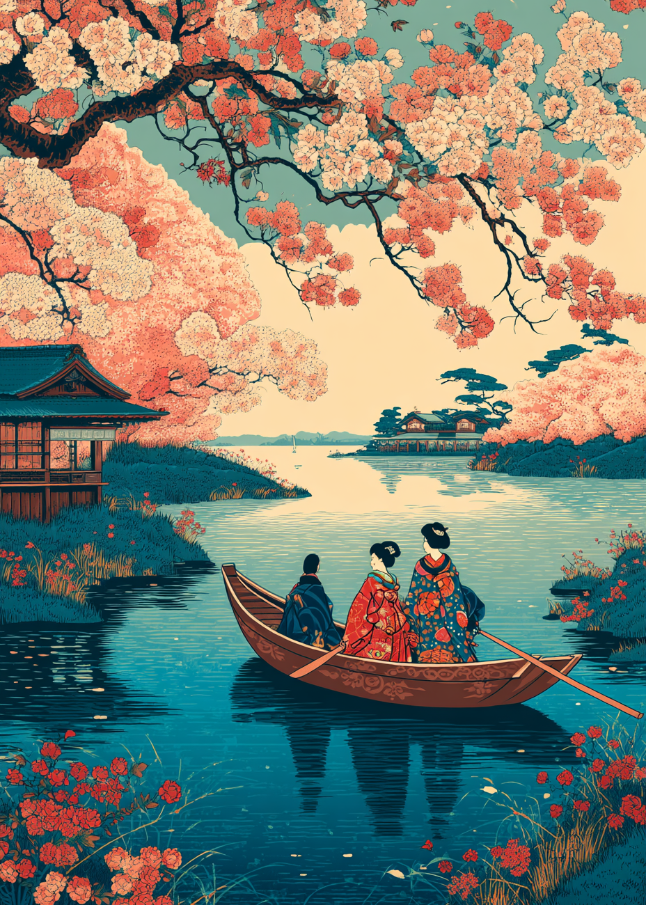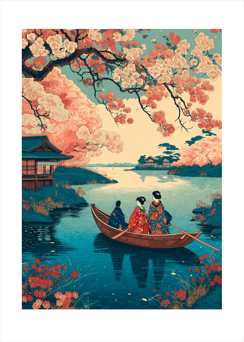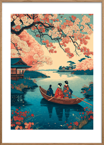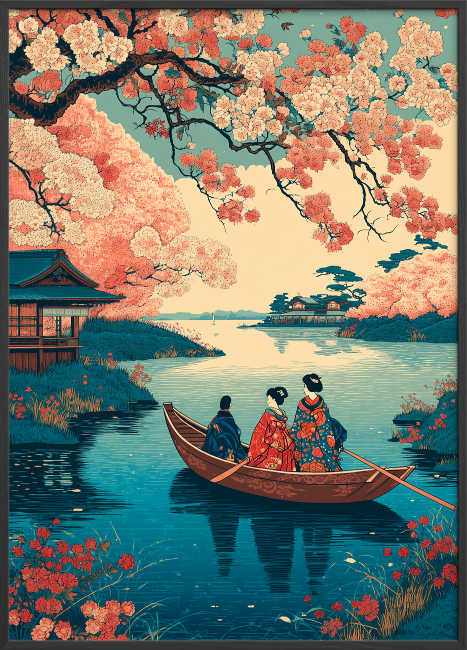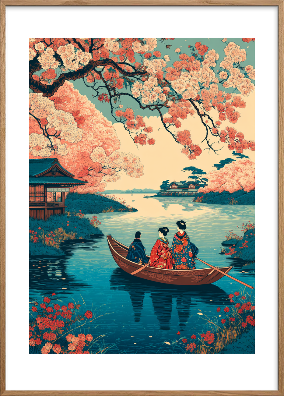 Oplev en fortryllende plakat, der bringer ro og japansk elegance ind i dit hjem. Detaljerede kimonoer, en stille bådtur og frodige kirsebærblomster er gengivet med fin linjeføring og rig ornamentik, som gør motivet velegnet til både stuen og soveværelset. Denne plakat er trykt på kvalitets papir i høj kvalitet med dybe, holdbare farver og præcis farveadskillelse, så hver nuance bevares over tid. Inspireret af ukiyo-e-stilen og kombineret med moderne grafisk tænkning fremstår billedet både klassisk og nutidigt — et blikfang på væggen eller en smuk gaveidé til kunstelskere. Vælg mellem flere størrelser og få en kantet ramme for et færdigt, galleriagtigt udtryk.