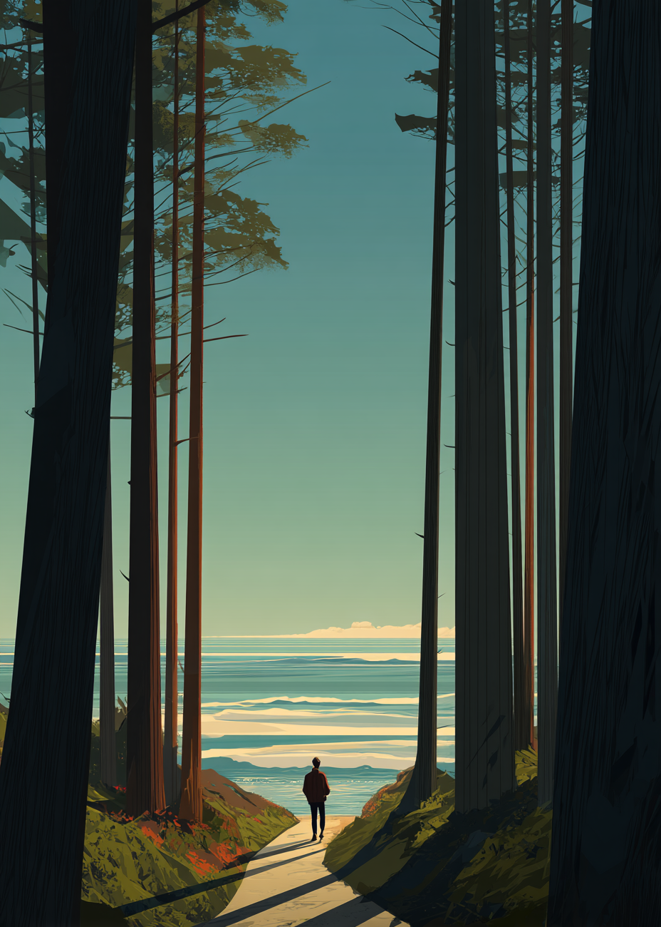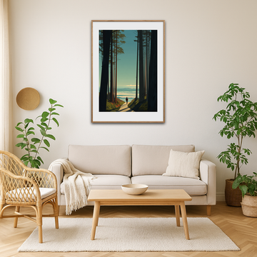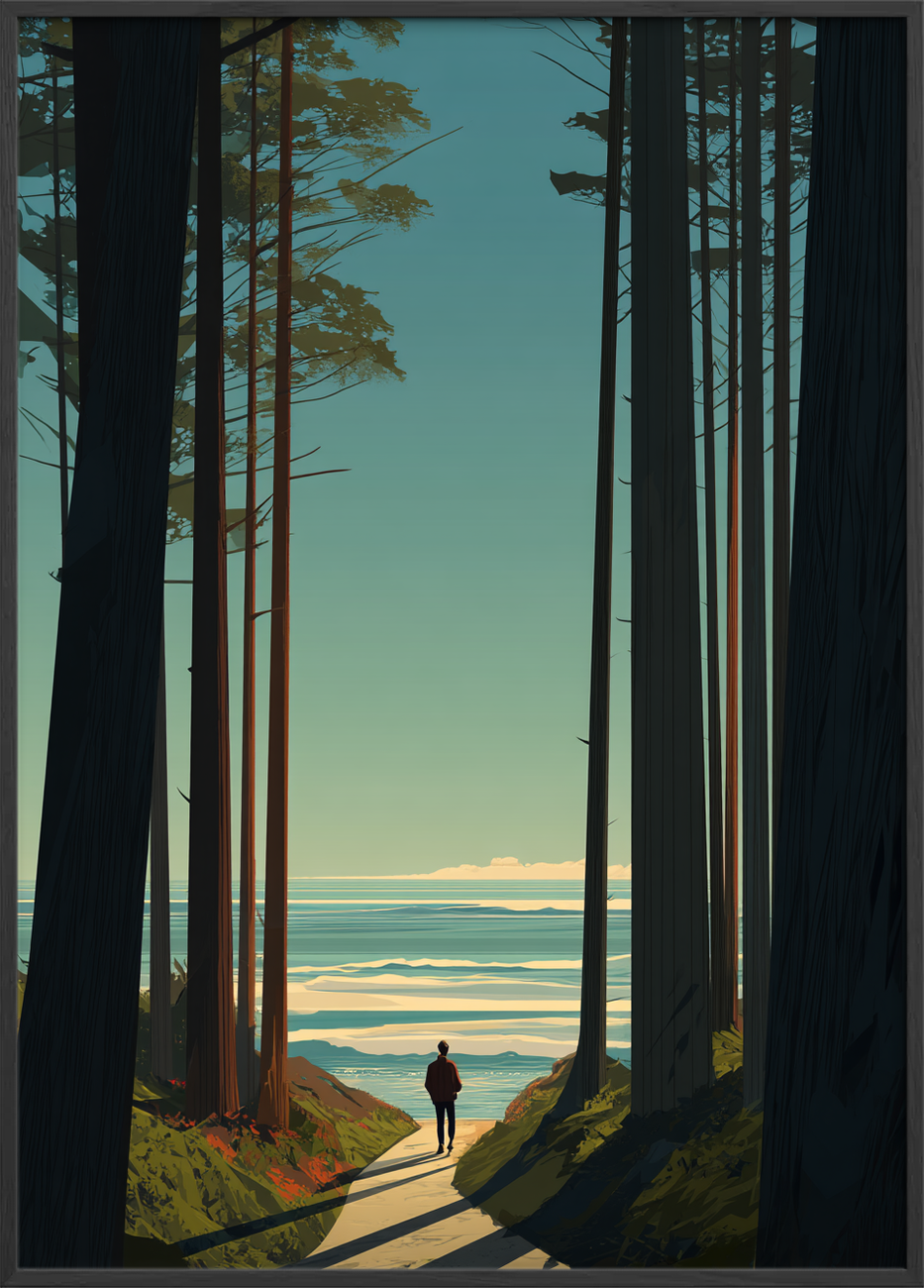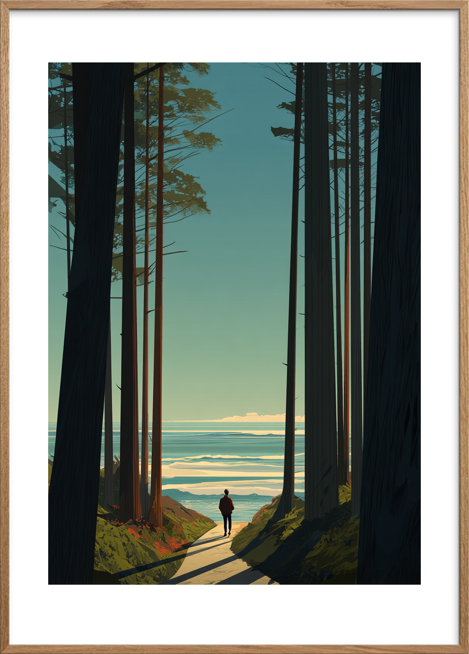 Denne plakat indfanger en stille kyststi, hvor høje træstammer rammer udsigten mod havet og himlen i en afbalanceret komposition. Motivet er ideelt til at skabe ro i stuen, gangen eller sommerhuset og fungerer som et dekorativt samtalestykke. Trykt på kvalitets papir med dybe, holdbare farver sikrer plakaten langvarig kvalitet og en luksuriøs følelse på væggen. I en moderne, digital kunststil kombineres minimalistiske flader og præcise linjer med varme skygger, hvilket giver billedet dybde uden at være overvældende. Vælg mellem flere størrelser og rammetyper, så plakaten passer til dit rum — nem at hænge op og let at kombinere med nordisk indretning. Perfekt som gave eller som et personligt statement i hjemmet.