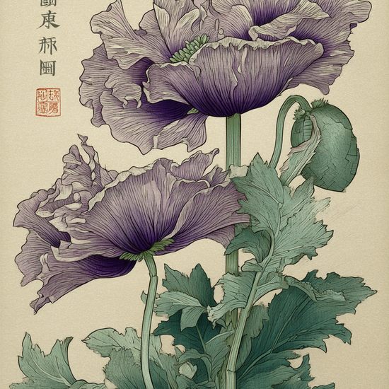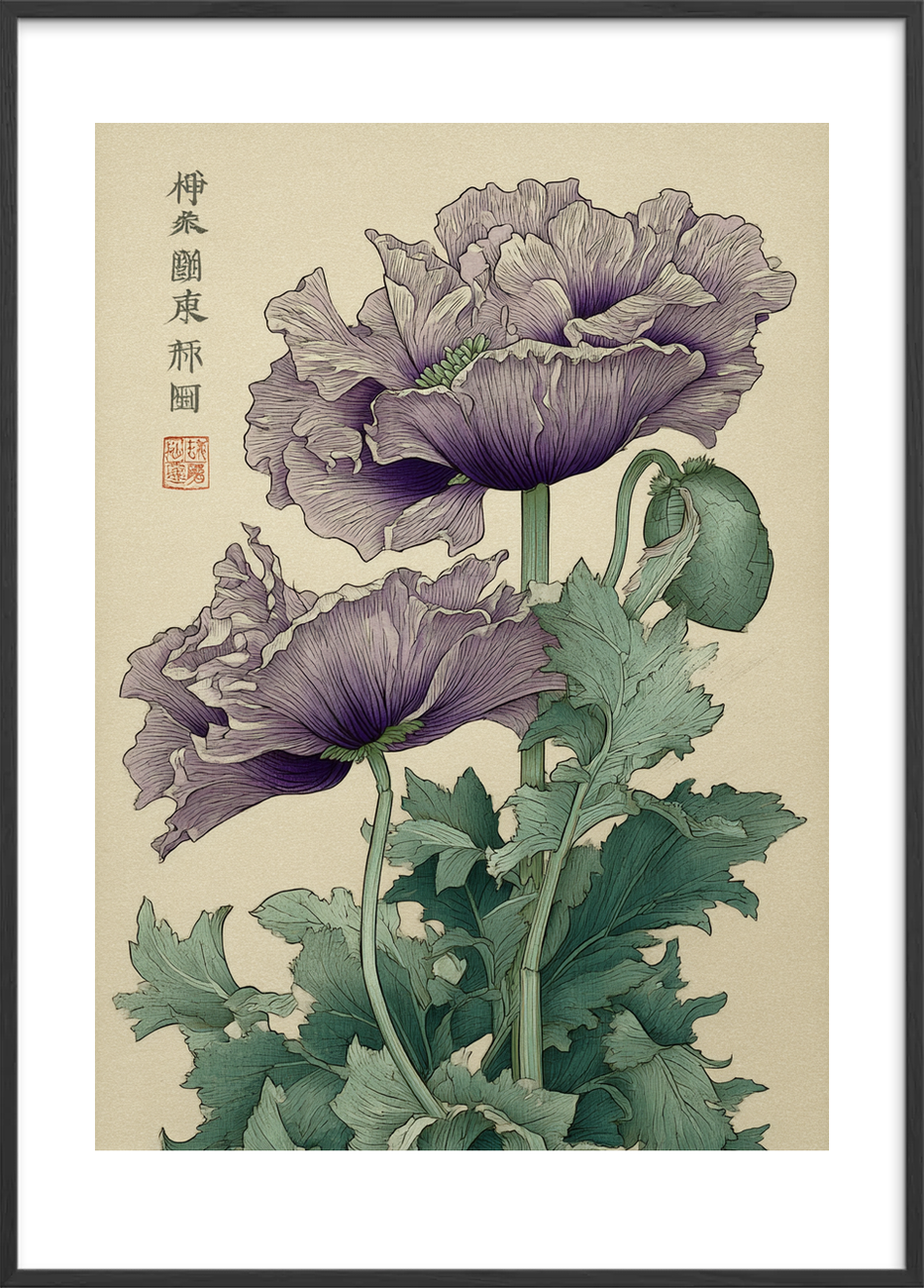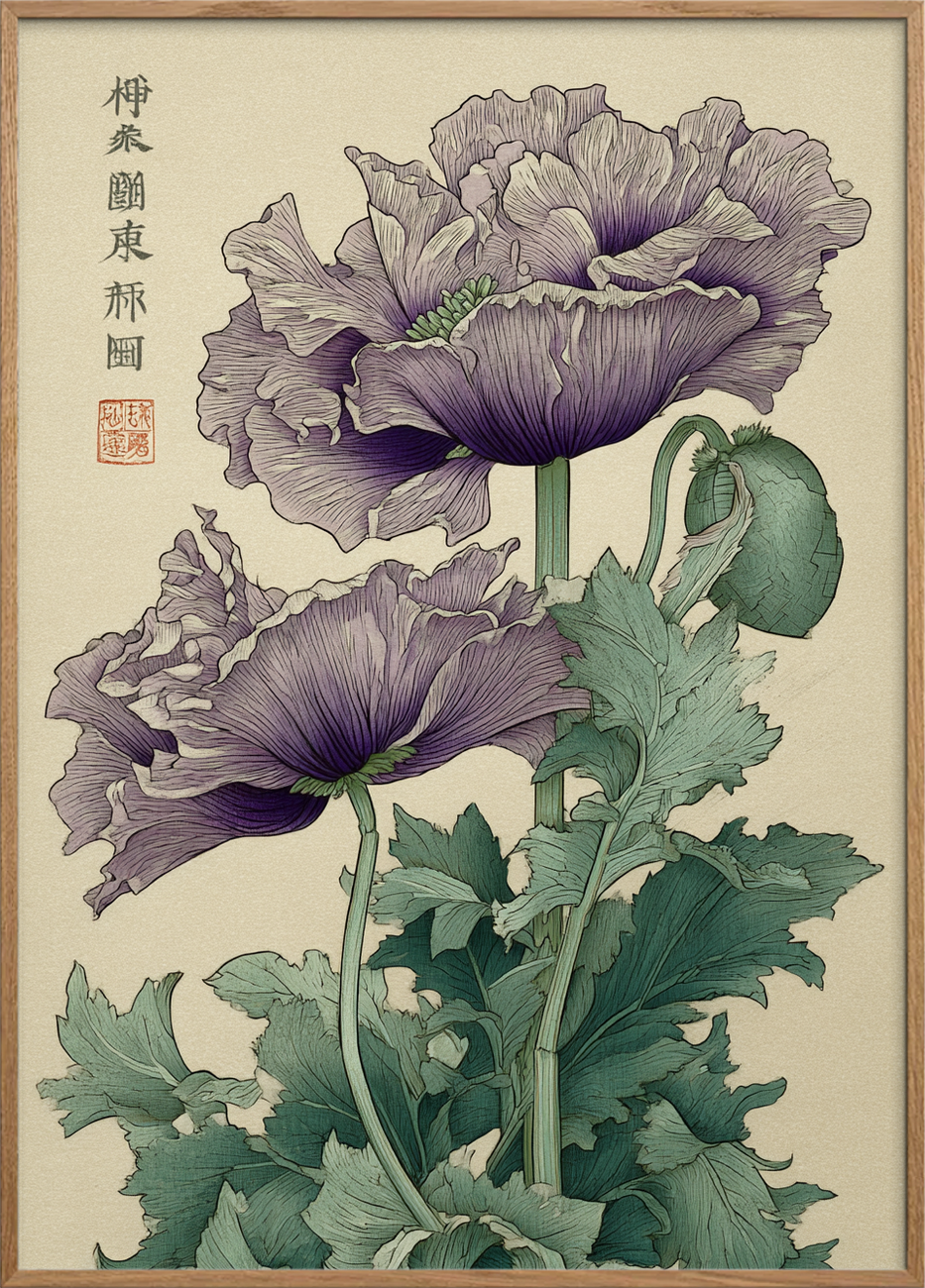 Giv dine vægge et elegant, botanisk udtryk med denne luksuriøse plakat af fine, violette opiumvalmuer. Motivets detaljerede linjeføring og bløde farveovergange skaber et klassisk, håndtegnet udtryk der passer til både moderne og nordisk indretning. Printet er lavet på kvalitets papir med høj opløsning for at sikre skarpe toner og holdbarhed over tid. Motivets raffinerede struktur og diskrete beige baggrund gør det nemt at matche rammer i træ eller sort metal. Inspireret af traditionelle japanske træsnit, tilbyder denne plakat både ro og udsmykning i ét. Perfekt som gave eller som et sofistikeret blikfang i stuen, entréen eller sommerhuset. Bestil i dag og få et kunsttryk der løfter rummet med naturens elegance.