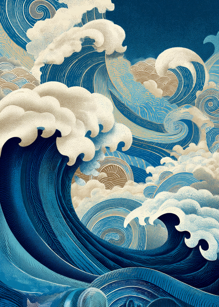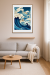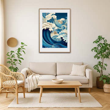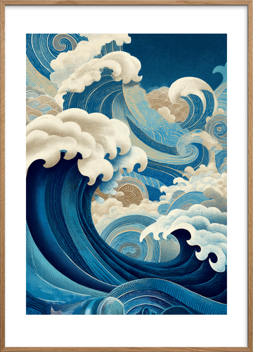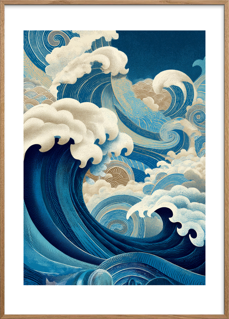 Denne plakat fanger havets kraft i et detaljeret, dekorativt udtryk, perfekt til at give enhver væg bevægelse og karakter. Trykt i høj opløsning på kvalitets papir med dybblå og gyldne nuancer, står motivet knivskarpt og modstandsdygtigt over for falming. Motivets dynamiske bølger og fine tekstur inviterer til nærstudie og fungerer både som et blikfang og en samtalestarter i stuen eller sommerhuset. Inspireret af ukiyo-e træsnittets æstetik og moderne grafisk tryk, kombinerer plakaten klassisk japansk ornamentik med nutidig farvepalet. Tilgængelig i flere formater; hæng den uden ramme for et råt, moderne udtryk eller vælg en let træramme for et mere raffineret look. Ideel gave til designelskere og dem, der ønsker kunst med energi og ro i ét.