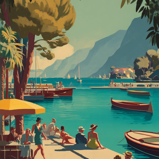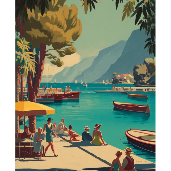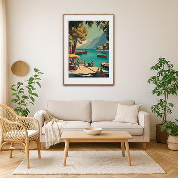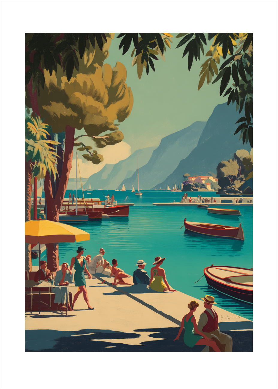 Opdag en stemningsfuld plakat der indfanger en solfyldt havn med både, promenader og dovne skygger — ideel til at skabe ferieoase i dit hjem. Motivets klare komposition og elegante figurer gør den velegnet over sofaen eller i sommerhuset; trykt på kvalitets papir i høj opløsning og tilgængelig i flere formater samt rammevalg. Denne trykserie kombinerer dekorativ appel med holdbar kvalitet, fremhæver turkise vandflader og varme skygger og fungerer både som samtalestykke og roligt blikfang. Stiludtrykket trækker på Art Deco-inspirerede grafiske flader og moderne farvepaletter, hvilket giver et tidløst, men samtidig friskt udtryk. Gør rummet levende — vælg størrelse og bestil din plakat i dag.