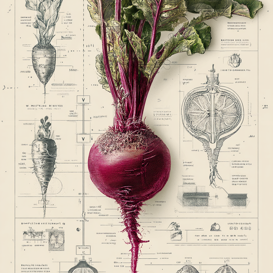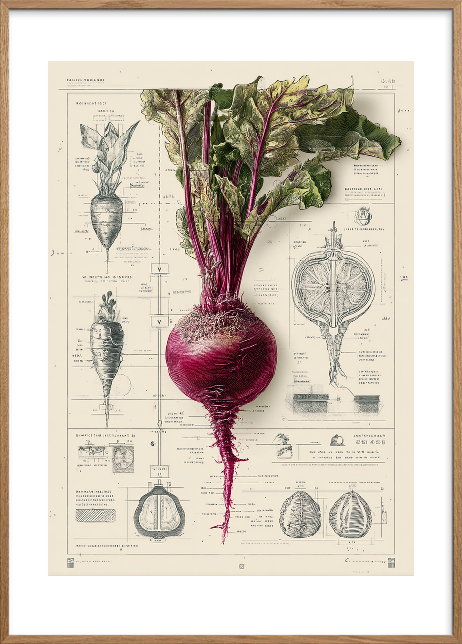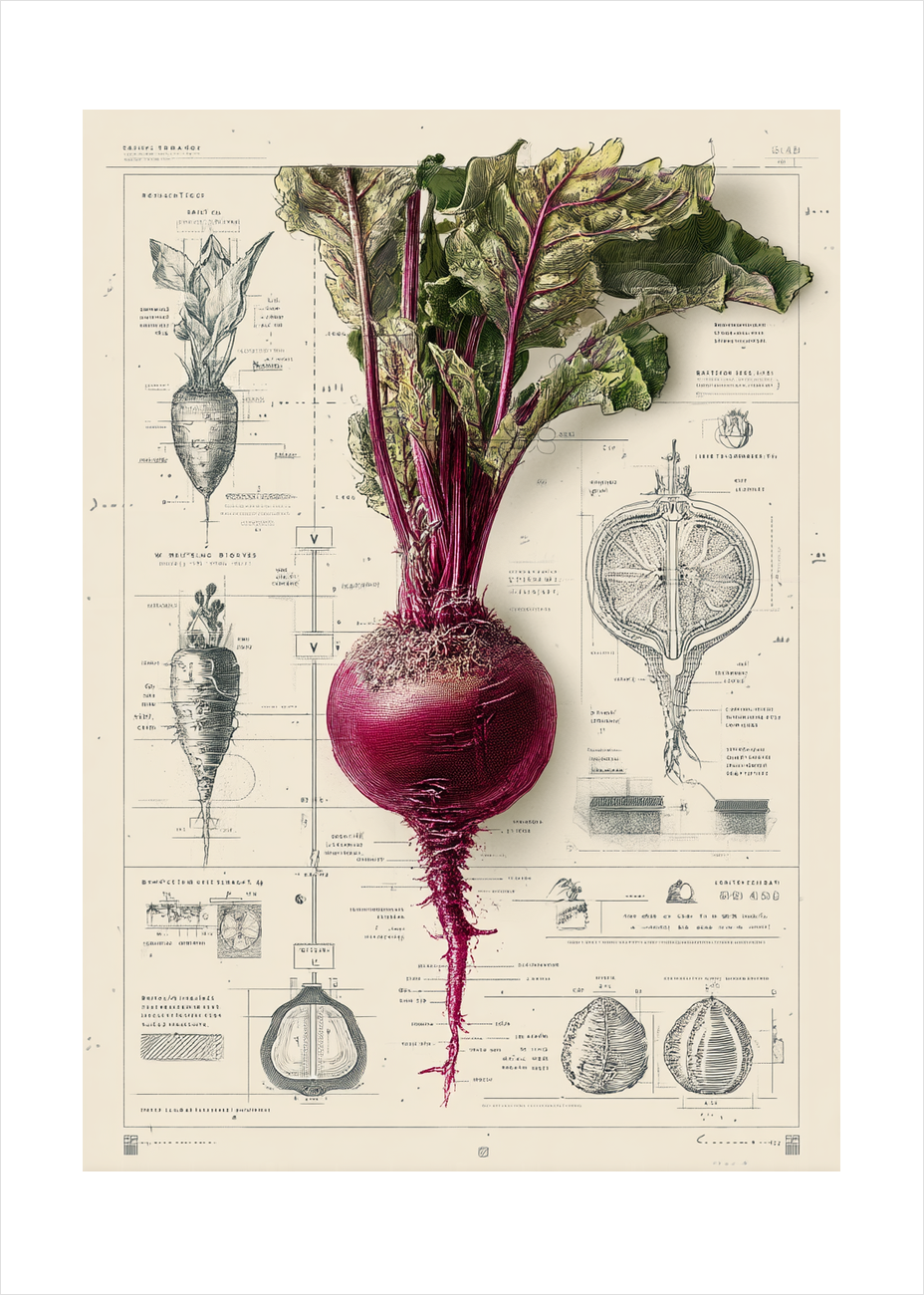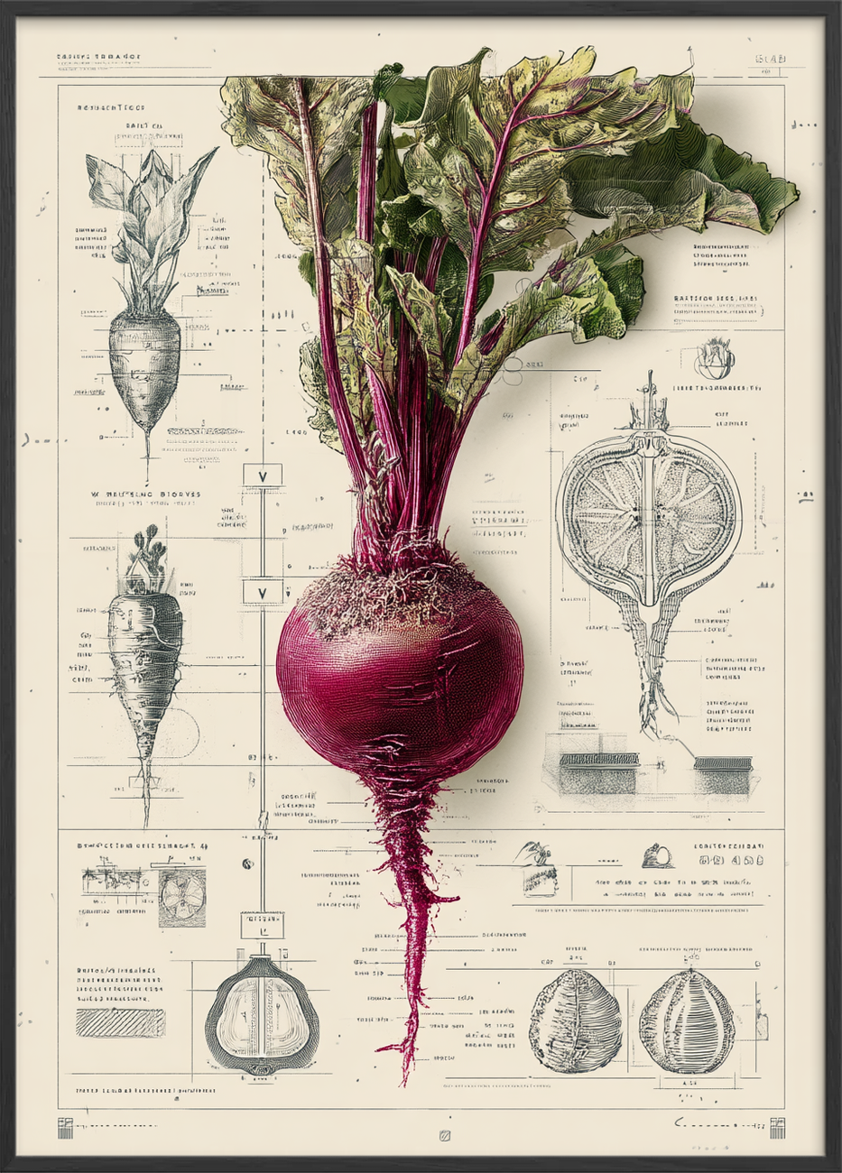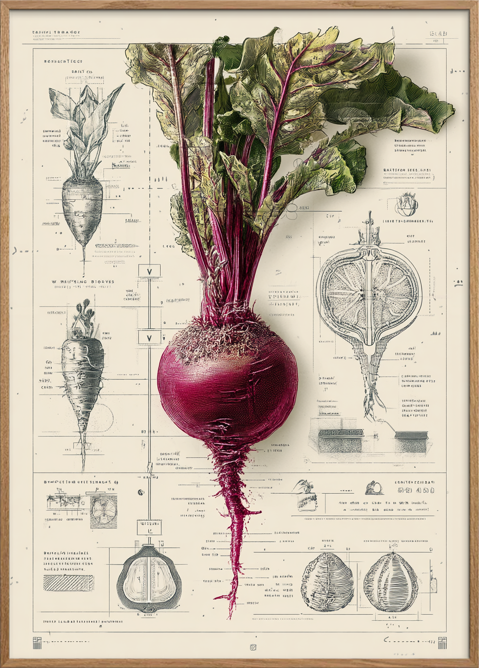 Elevér dit køkken eller spisekrog med denne elegante plakat, der forener videnskabelig præcision og dekorativ æstetik. Motivets detaljerede rødbede og tekniske skitsebaggrund gengives i høj opløsning på kvalitets papir med skarp, holdbar trykfarve — ideel til indramning eller som et markant statement på væggen. Plakaten er udført i en historisk botanisk illustrativ stil med moderne digital farvelægning, hvilket skaber en smuk kontrast mellem vintage linjeværk og levende magenta- og grønne toner. Vælg mellem flere standardformater, og giv hjemmet et kunstnerisk løft; perfekt som gave til mad- og designinteresserede eller til at bringe naturens detaljer tættere på interiøret.