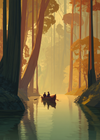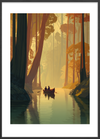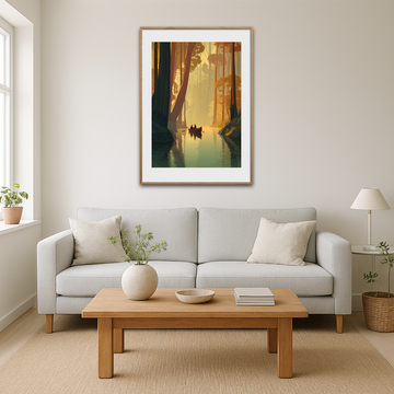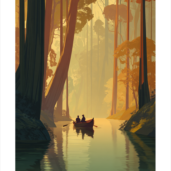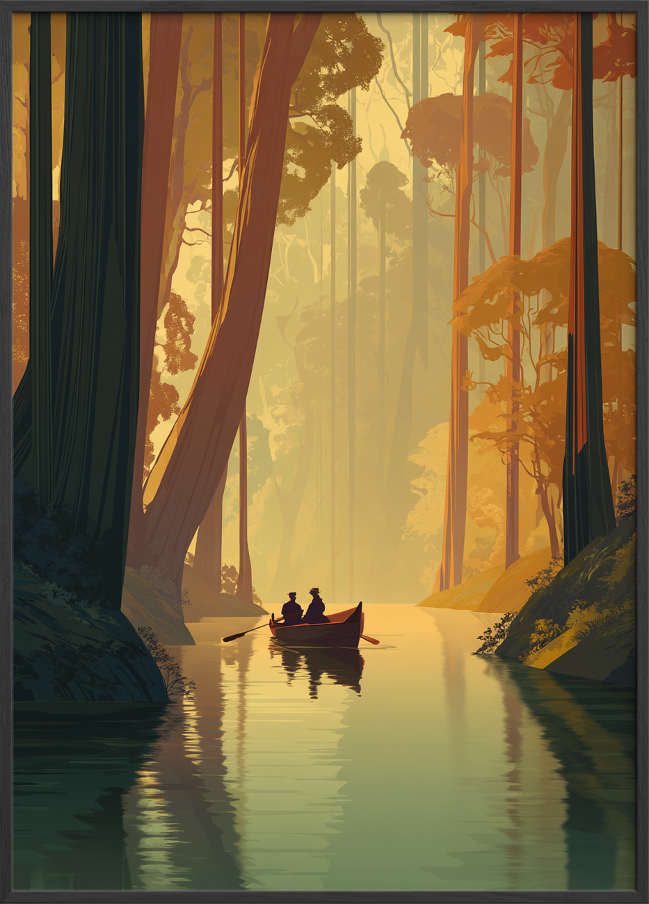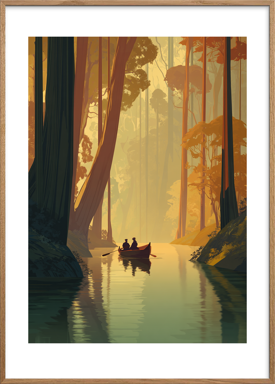 Denne plakat inviterer til ro og fordybelse med en varm og stemningsfuld skovscene, der fører blikket langs en stille flod hvor to personer i en robåd glider forbi høje træstammer. Motivets rolige komposition og bløde farveovergange gør det ideelt til at skabe en afslappet atmosfære i stuen eller sommerhuset. Udformet i en moderne, grafisk illustrationstil med digital finish, fremhæver trykket lange vertikale former og et gyldent lys, som giver dybde og harmoni. Trykt på kvalitets papir i høj opløsning, fås plakaten i flere standardformater og leveres rullet i beskyttende tube klar til indramning. Perfekt som gave til naturelskere eller som et statement-piece i entréen — kombiner med en enkel ramme i træ eller sort metal for maksimal effekt og langvarig kvalitet.