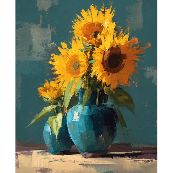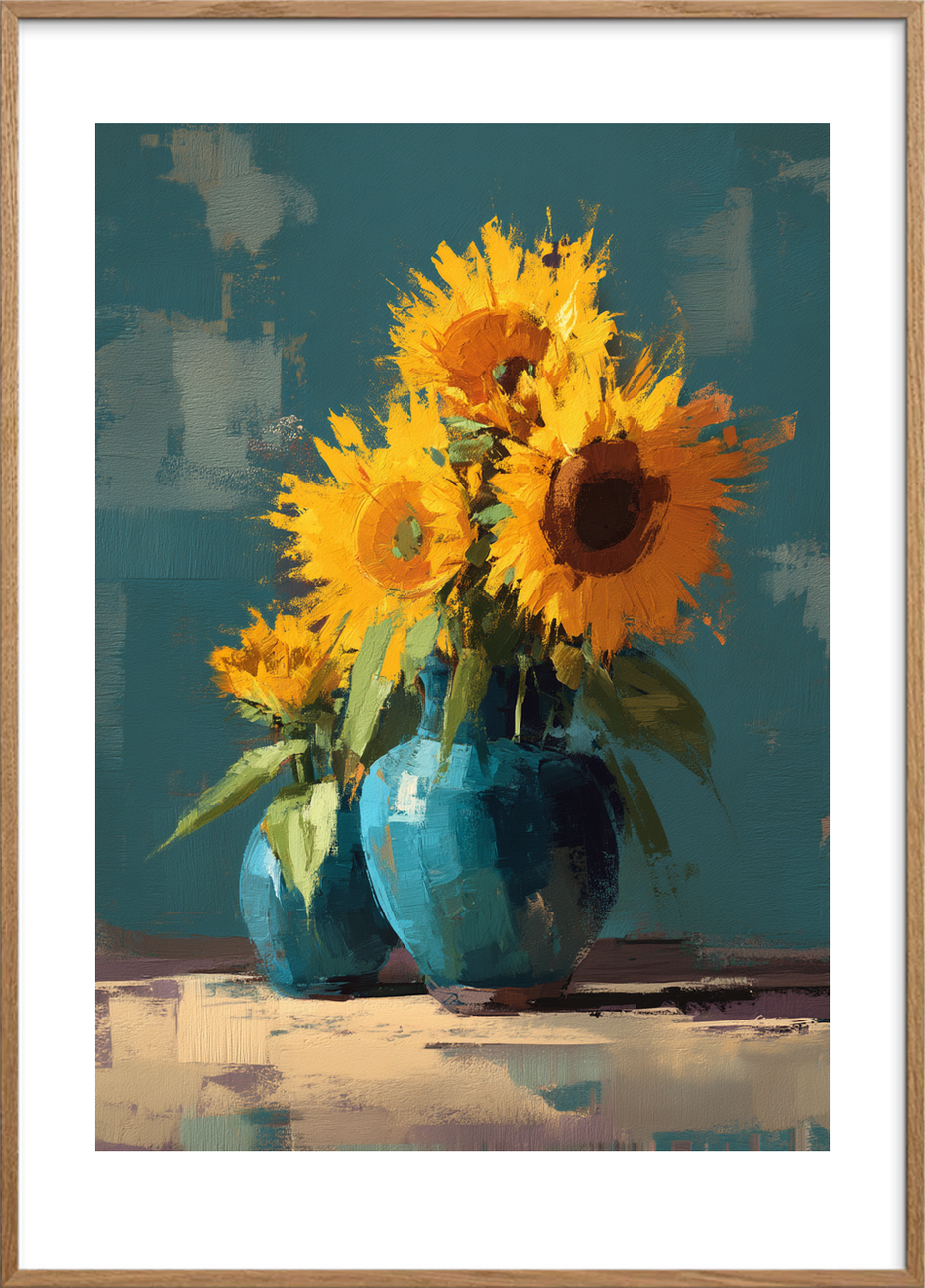 Denne stilsikre plakat med solsikker i blå vaser bringer varme og energi ind i ethvert rum. Motivet fanger et frodigt buket af solrige solsikker sat i klare turkise vaser, hvor kraftfulde penselstrøg og tekstur skaber dybde og bevægelse. Trykt i en nutidig impressionistisk stil på højkvalitets kunstpapir, bevarer reproduktionen maleriets levende farvepalet og strukturelle kontraster. Perfekt til stuen eller køkkenet og ideel som gave — leveres i flere størrelser og kan rammes efter ønske. Den intense gul-orange palet mod en dæmpet blå baggrund gør motivet både iøjnefaldende og harmonisk; et sikkert blikfang der løfter din indretning med solskinsstemning og håndgribelig tekstur.