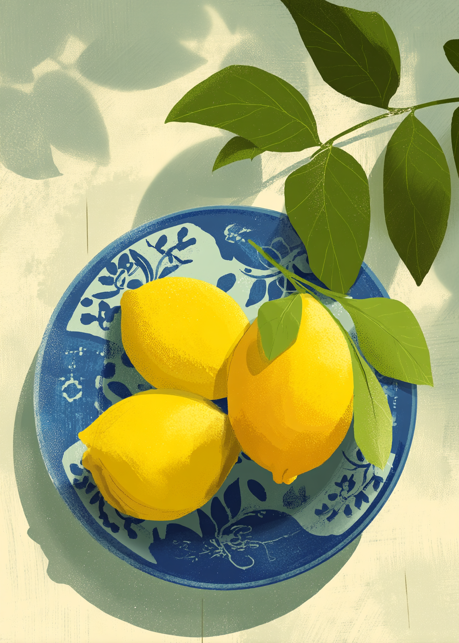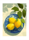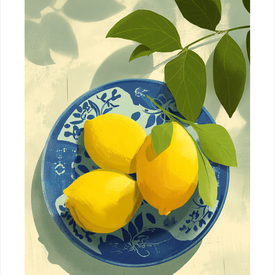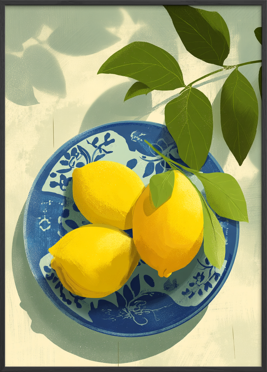Tilføj et friskt og solrigt touch til dit hjem med denne iøjnefaldende plakat med citroner i en blå skål. Printet fremhæver klare, mættede farver og detaljerede blade, der skaber et livligt fokuspunkt over spisebordet eller i køkkenet. Plakaten er designet til at give varme og energi til rummet uden at dominere indretningen, og den fungerer lige så godt i ramme som alene på væggen. Trykt på kvalitets papir med høj farveægthed for langvarig glans og dybde. Denne udgave kombinerer dekorativ appel med praktisk holdbarhed og er perfekt som gave til dem, der elsker madstil og botaniske motiver. Udført i en moderne grafisk illustrationstil med klare flader og subtile teksturer, der fremhæver kompositionens rytme og form.