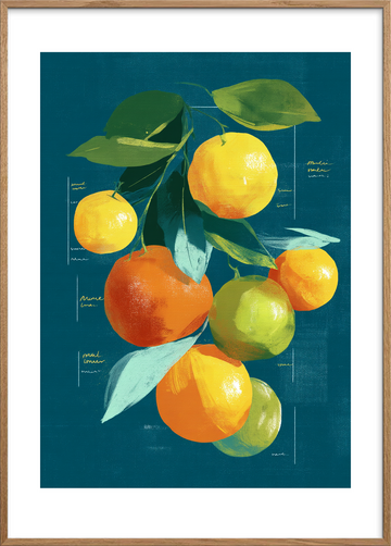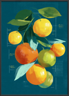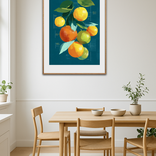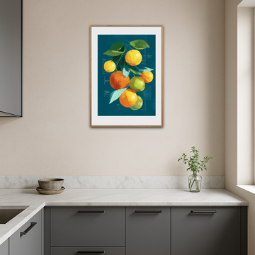 Giv hjemmet et frisk pust med denne livlige plakat af modne citrusfrugter på en dyb, petrolblå baggrund. Motivet fremstår i klare, mættede farver og en struktureret penseltekstur, der skaber en følelse af håndmalet kvalitet samtidig med et moderne grafisk udtryk. Stilen er nutidig grafisk illustration med inspiration fra modernismens farveeksperimenter, hvilket gør plakaten velegnet som blikfang over køkkenbordet, i spisestuen eller i sommerhuset. Den enkle, rytmiske komposition og geometriske linjer gør motivet let at kombinere med både skandinaviske og farverige indretninger. Bestil din plakat i dag og opgrader væggen med et kunstnerisk og friskt statement, der både føles tidløst og moderne.
