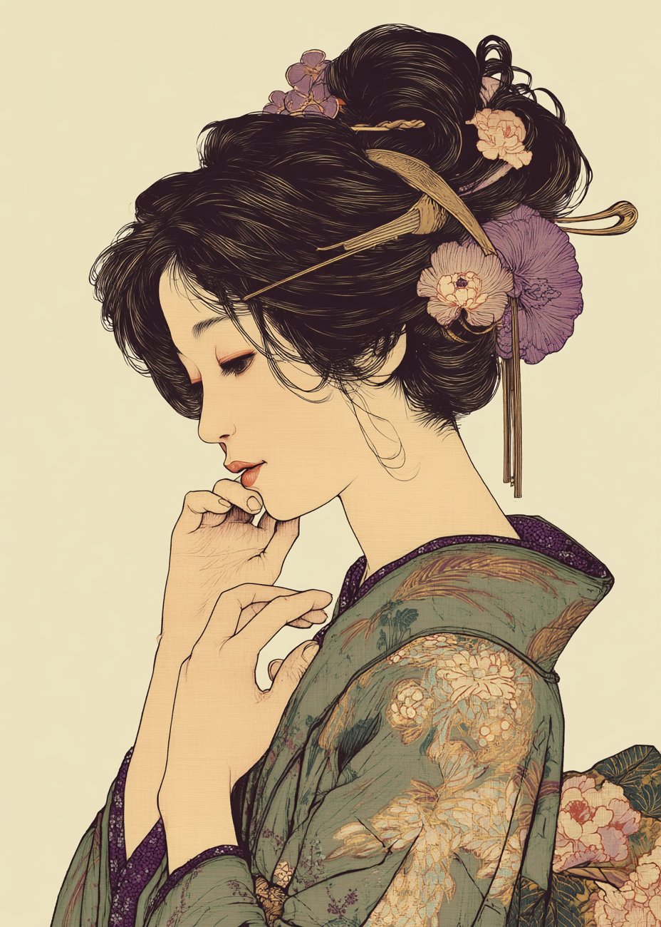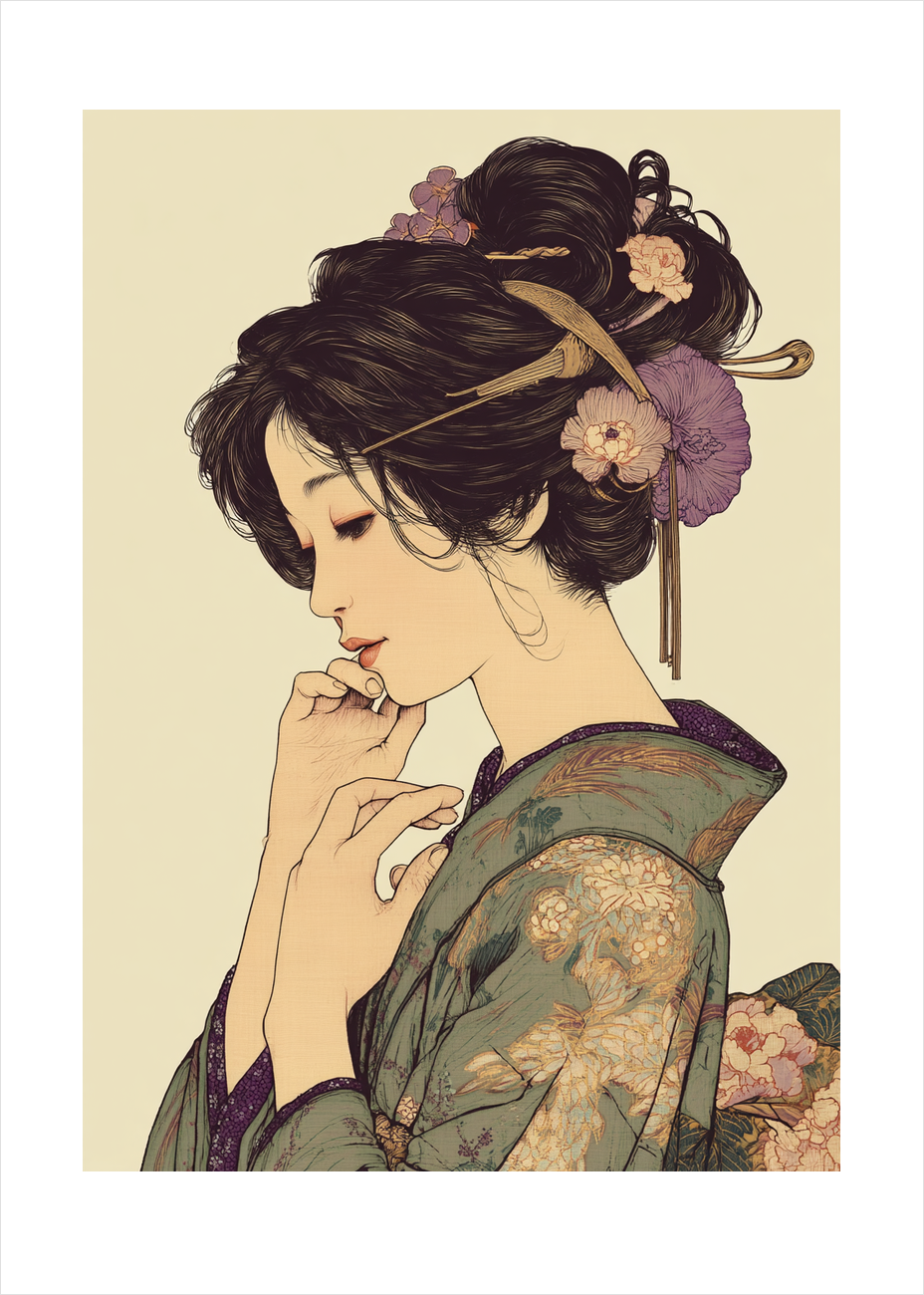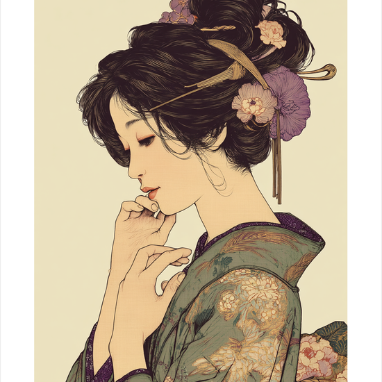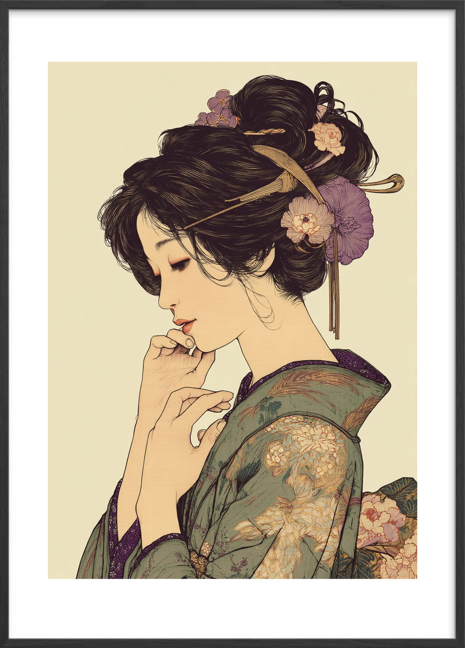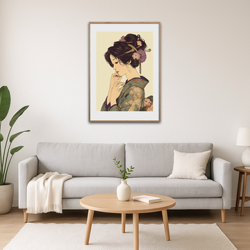 Denne elegante plakat fremhæver et stille, feminint portræt med blide konturer, fine detaljer og et roligt farveunivers, der løfter enhver væg. Motivet indfanger varme beige toner og mønstrede kimono-tekstiler med blomsterdekorationer, hvilket gør plakaten ideel som central dekoration i stuen eller soveværelset. Trykt på kvalitetspapir med dybde i linjerne og en subtil teksturoverflade får motivet et håndlavet præg og lang levetid. Stilen trækker på ukiyo-e og art nouveau, hvilket giver en klassisk samtidig oplevelse, perfekt til designbevidste hjem. Vælg mellem flere standardformater, tilføj ramme i egetræ eller sort metal, og vælg en limited edition-udgave for en mere eksklusiv gave. En smuk gaveidé til kunstelskere og alle, der søger en sofistikeret, rolig plakat til indretningen.