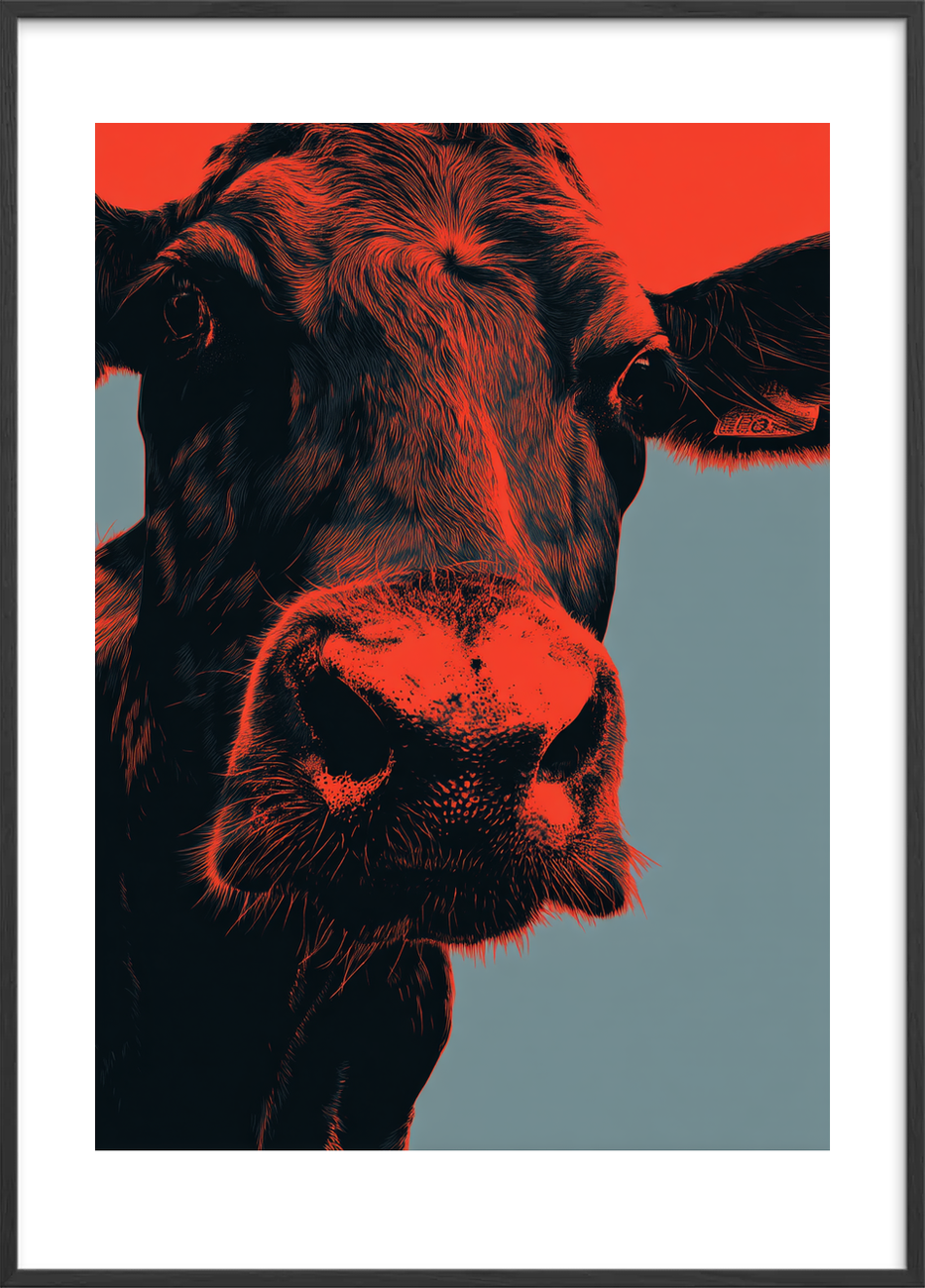 Denne plakat fanger opmærksomheden med et tæt, nærgående portræt af en ko i stærke kontraster og detaljerede linjer. Trykt i høj opløsning på kvalitets papir, giver motivet stor visuel gennemslagskraft og lang holdbarhed. Inspireret af pop art og serigrafiens æstetik fremhæves motivets struktur gennem dybe mørke felter og vibrerende røde felter, hvilket gør plakaten til et moderne blikfang i ethvert rum. Perfekt til køkkenet, stuen eller sommerhuset og leveres klar til indramning — vælg mellem flere formater for at passe din væg. En ideel gave til designinteresserede eller dem, der ønsker et kunstnerisk statement uden at gå på kompromis med kvaliteten.