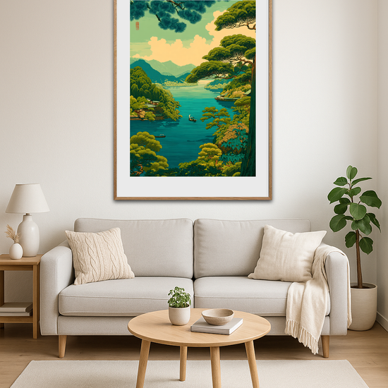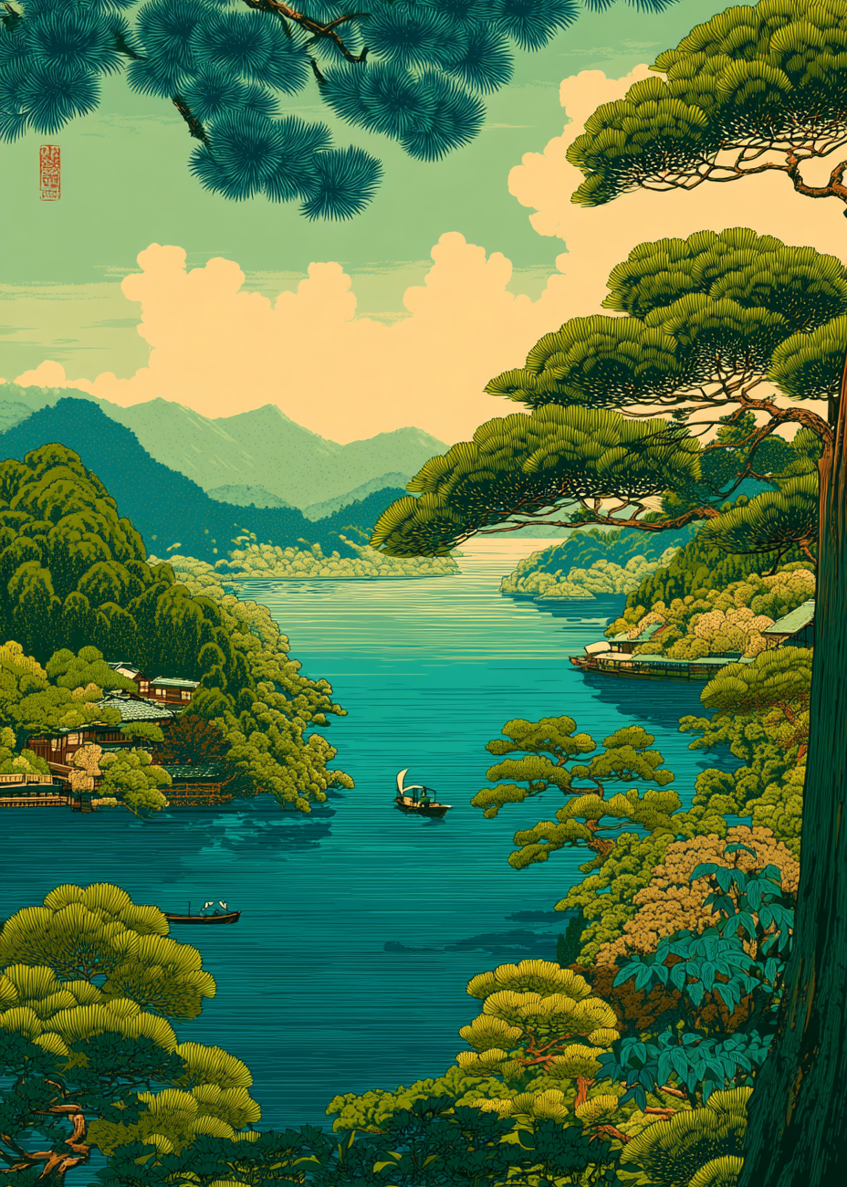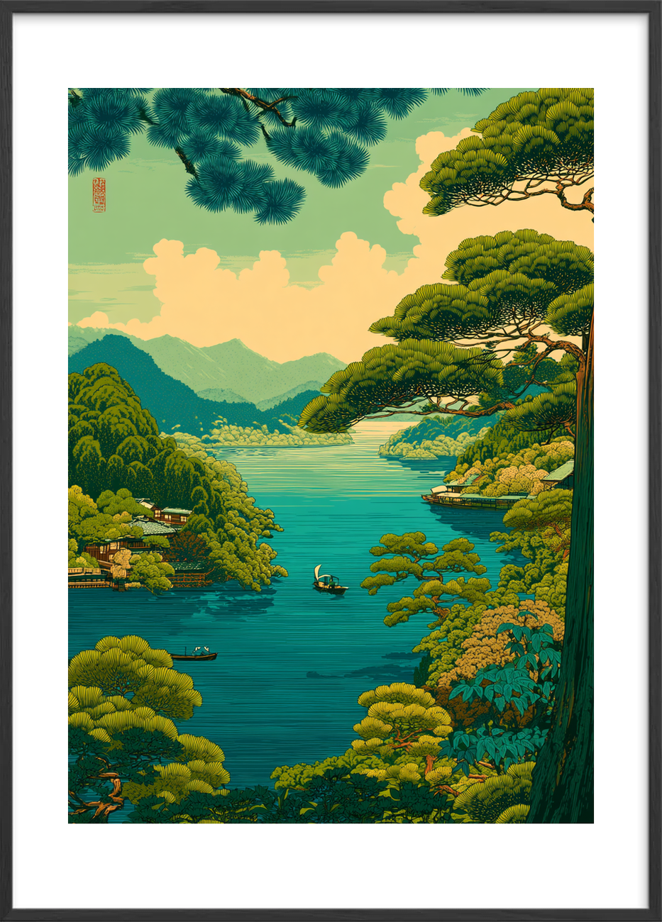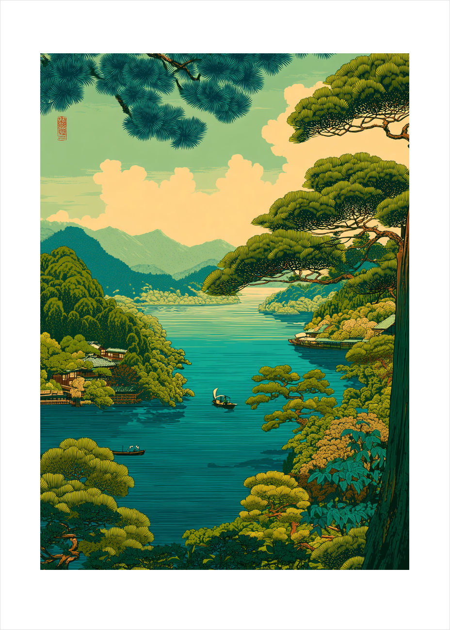 Giv dit hjem en følelse af ro og tidløs elegance med denne plakat, der indfanger et stille sølandskab fyldt med fyrretræer, både og bløde bjergformer. Trykt i høj opløsning på kvalitets papir med dybe, mættede farver og en lækkert finish, fås plakaten i flere formater og leveres klar til indramning — perfekt som gave eller som midtpunkt på væggen. Motivet indbyder til fordybelse og fungerer lige godt i moderne som traditionelle interiører. Designet er inspireret af klassiske japanske træsnit og ukiyo-e, hvor rene linjer, gentagne mønstre og kontrollerede farveflader skaber et grafisk og poetisk udtryk. Bestil nu og løft din indretning med en plakat, der kombinerer kunsthistorisk tyngde med nutidig finish.